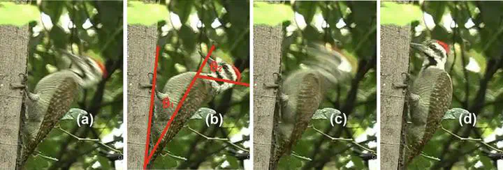 Four Stage Woodpecker Pecking ProcessTo understand how a woodpecker can accelerate its head to high velocity in a short time without injury, a multi-rigid-segment model of its body was established based on skeletal specimens and high-speed video analysis. The study found that the high head velocity results from a whipping effect produced by coordinated muscle torques and tendon stiffness. By comparing the responses of hinged and rigid rods, three response modes were identified; among them, Mode II achieves the highest free-end velocity, analogous to the woodpecker’s strike. The multihinge model further showed that the free-end velocity increases with the number of hinges, explaining how the woodpecker’s long neck enhances impact speed.
